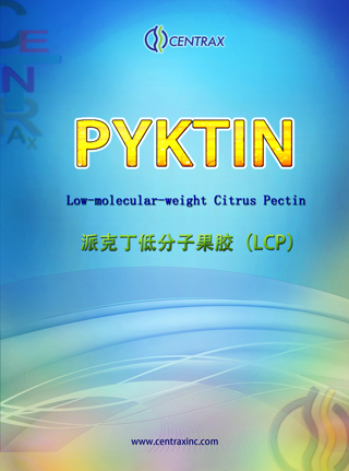 派克丁低分子果胶(LCP)是来自天然产物柑橘类水果的精髓.从中提取得到的一种以半乳糖为主要成份的多糖,它具有与恶性表型细胞亲和,粘附特性,特异性地杀伤已突变细胞的功能,使突变细胞在未形成之前即被清除.这种较小的多糖基团还能够紧紧地结合在癌细胞膜表面上能与半乳糖结合的特定部位,形成一种特异的复合体,并阻止突变细胞间的聚集及突变细胞粘附到邻近的细胞血管和组织.细胞培养试验,动物试验和临床研究证明(CP – LCP)具有肿瘤细胞表面受体结合的功能,经常服用明显改善免疫功能,降低肿瘤的侵袭和转移的风险,保持健康.